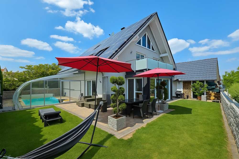 Ein weiteres Highlight ist die moderne Schwimmhalle im Garten, die sich im Sommer auffahren lässt und so ganzjährig Badespaß garantiert. Der Außenbereich ist mit einer hochwertigen Granitmauer eingefasst. Die Garage bietet nicht nur Platz für Ihr Fahrzeug, sondern verfügt zusätzlich über ein Obergeschoss mit praktischem Stauraum, der bequem über eine Treppe zugänglich ist.