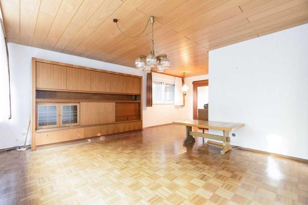 Das weitläufige Wohn- und Esszimmer bildet das Herzstück der Wohnung. Dank der geschickten Raumaufteilung ist der Essbereich etwas abgetrennt, sodass eine klare Gliederung entsteht – perfekt für gemütliche Mahlzeiten, ohne auf die offene Weite des Wohnraums verzichten zu müssen. Das Wohnzimmer mit klassischem Parkettboden, wohnlicher Holzdecke und großen Fensterflächen wirkt einladend und repräsentativ zugleich. Von hier aus gelangen Sie auf den sonnigen Hauptbalkon, der mit seinem idyllischen Blick ins Grüne ein wunderbarer Ort für Entspannung und gesellige Stunden ist.