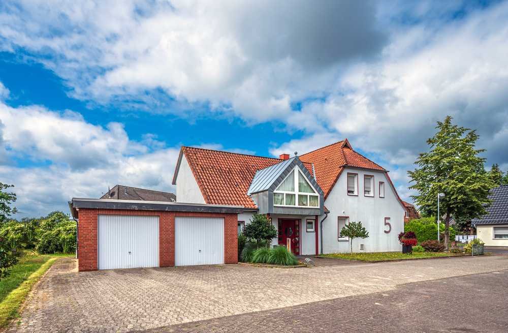 Das Grundstück umfasst 1.410 m² und bietet neben dem Haus eine Doppelgarage mit Abstellraum, mehrere PKW-Stellplätze sowie eine großzügige Südterrasse. Der Garten ist pflegeleicht mit Rasenflächen und Sträuchern gestaltet und mit einem Bewässerungssystem ausgestattet.
