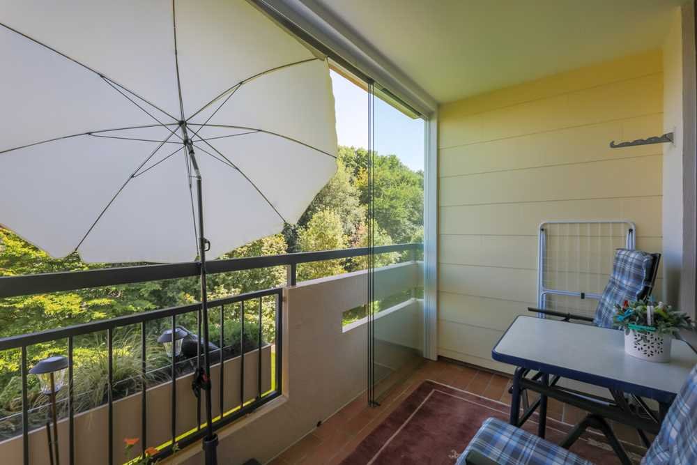 Durch den geräumigen Flur mit Garderobe und Abstellraum erreichen Sie das innenliegende Badezimmer, die helle Küche mit Aussicht über Pforzheim sowie den Wohn-/Essbereich mit Zugang zum Balkon und Blick ins Grüne. Vom Essbereich können Sie ebenso den Blick über Pforzheim schweifen lassen.