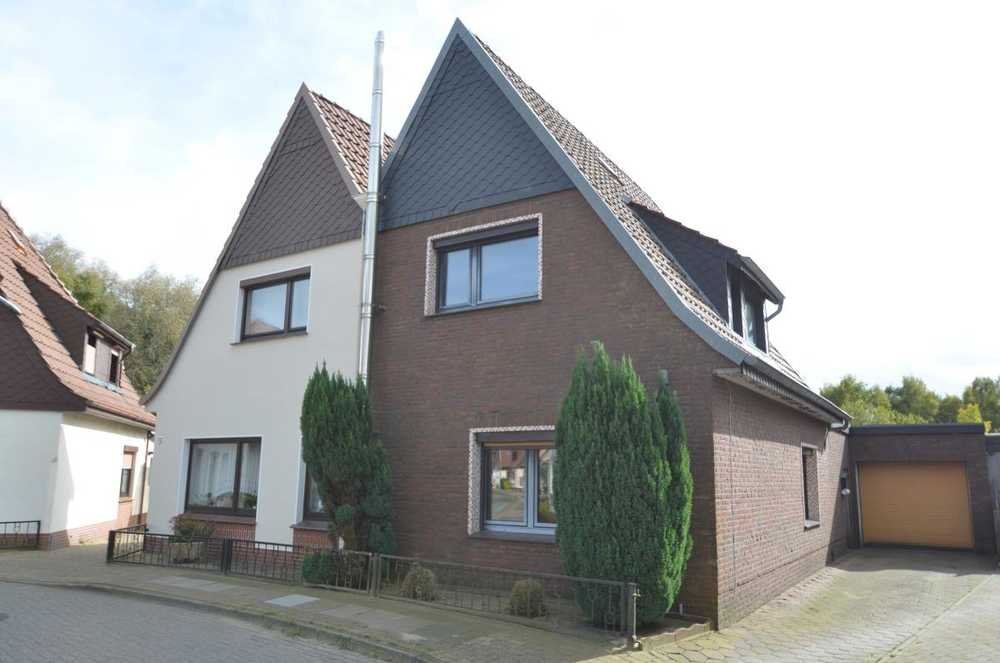 Typische Doppelhaushälfte mit Garage und weiteren Nebengebäuden hinter dem Haus.