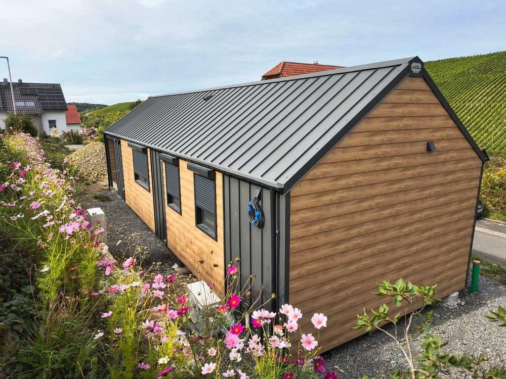 - ein Fertighaus (Holzständerbauweise, ebenerdig), nicht winzig, aber kompakt: 13,5m x 4,3m außen;