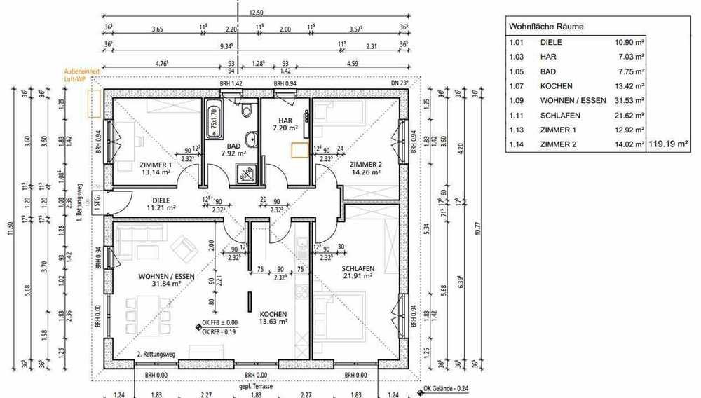 Aufgrund der geltenden Schallschutzbestimmungen wegen des BER, wurde keine Holzbalkendecke verbaut sondern eine Betondecke (Mehrpreis ca. € 20.000,-), das Aussen-Mauerwerk (sowie die tragende Innenwand) wurden in 17,5 hochverdichetem Kalksandstein gebaut plus Dämmung.