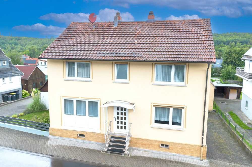 Zum Kauf steht ein freistehendes Einfamilienhaus in Merkenfritz, einem Ortsteil der Wetterauer Gemeinde Hirzenhain in Hessen.