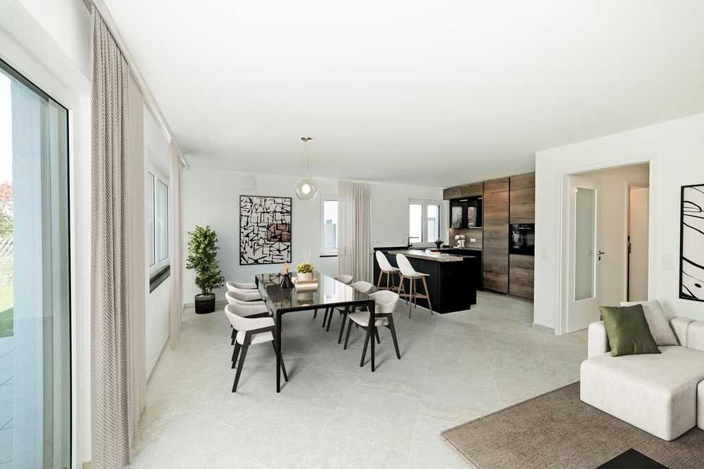 Im Erdgeschoss lädt der offene Wohn- und Essbereich mit direktem Zugang zur sonnigen Terrasse und dem liebevoll angelegten Garten zum Entspannen und Genießen ein. Die hochwertige Einbauküche, edle Materialien sowie geschmackvolle Details unterstreichen den gehobenen Anspruch des Hauses.