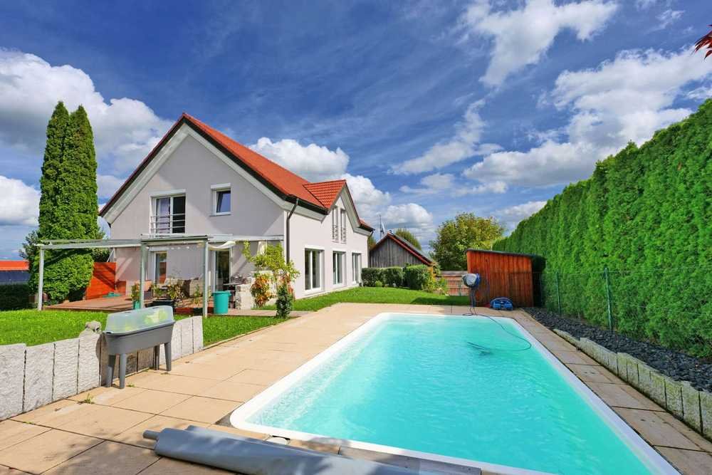 Der Mittelpunkt des Hauses ist der offene Wohn- und Essbereich – ein Raum, der Familie und Freunde zusammenführt, Gespräche, Lachen und Genuss in sich vereint. Von hier führt der direkte Zugang hinaus in den weitläufigen Garten. Auf dem rund 819 m² großen Grundstück verschmelzen Natur und Privatsphäre zu einer Oase des Wohlbefindens. Besonders hervorzuheben ist der stilvolle Außenpool, der im Sommer zum erfrischenden Mittelpunkt des Lebens wird und den Außenbereich zu einem ganz besonderen Rückzugsort macht.