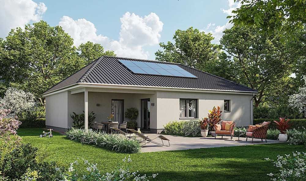 Seit über 90 Jahren bauen wir bereits Massivhäuser. Dieses Know-How und Können haben wir in unseren Massivhäusern voll eingebracht. Der Bungalow B960 bietet auf fast 125 m² Platz für die ganze Familie. Das Wohn- und Esszimmer bildet den Mittelpunkt des Hauses. Von dort gelangt man in alle weiteren Zimmer. Und Platz für ein Gästezimmer wurde auch noch geschaffen. Ein Highlight ist die überdachte Terrasse unter der man auch mal bei Regen sitzen kann.
