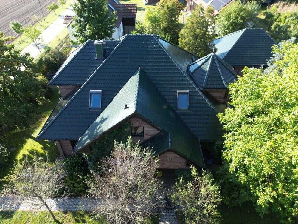 Die Klinkerfassade aus Holländer- Handformsteinen und die Bedachung mit dunkel glasierten Biberschwänzen geben dem Haus einen edlen Look.