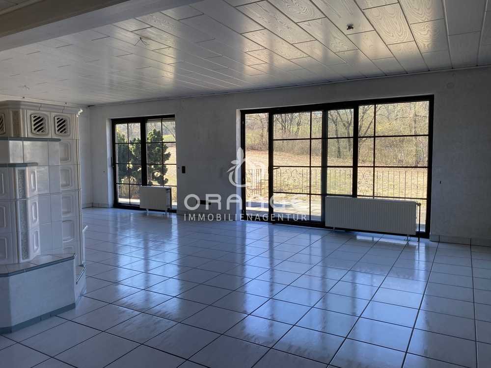Das Erdgeschoss beherbergt ein sehr großes Wohnzimmer mit einem besonders schönen Kachelofen und bodentiefe Fenster.