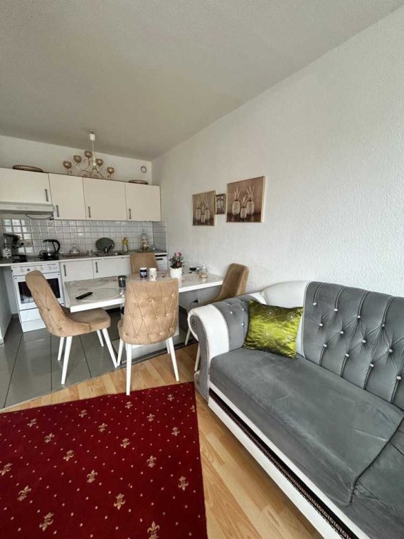 Zur Wohnung gehört eine kleine, weiße Einbauküche mit Backofen, Herd, Dunstabzugshaube. Der Küchenbereich ist mit grauen Feinsteigzeug-Platten gefliest, die übrige Wohnung hat einen Oberboden aus Laminat in heller Eichen-Optik.