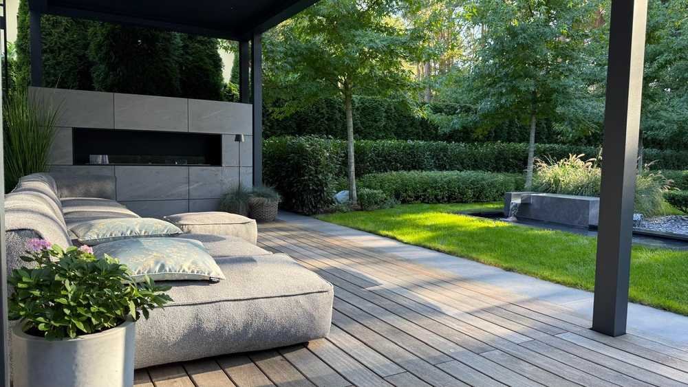 Der Garten ist mehr als Außenraum – er ist Bühne und Rückzugsort zugleich: mit Wasserfall, Pavillon aus sibirischer Eiche und einer Barbecue-Zone. Über eine Granittreppe mit Glasgeländer öffnet sich das Obergeschoss mit drei Zimmern, großem Bad und Balkon.