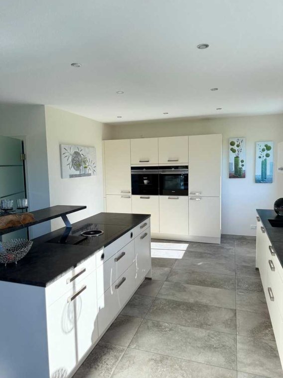 Im oberen Stockwerk befinden sich zwei Kinderzimmer, ein großes Schlafzimmer mit begehbarem Kleiderschrank und ein modernes Badezimmer. Der offene Wohn-Ess und Kochbereich lädt zum Verweilen ein und ist mit einem hochwertigen Kachelofen ausgestattet. Die Einbauküche lässt keine Wünsche offen und bietet Ihnen alle Annehmlichkeiten, die Sie sich wünschen. Ein Gästezimmer, das auch als Sauna genutzt werden kann, rundet das Angebot im oberen Stockwerk ab.