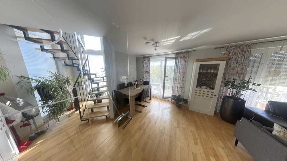 Die Wohnung befindet sich im 3. Obergeschoss und erstreckt sich über zwei Wohnebenen sowie ein ausgebautes Dachgeschoss, das über eine praktische Einschubtreppe erreichbar ist. Dank der internen Verbindung bietet die Wohnung das Gefühl eines kleinen Hauses – mitten in der Stadt.