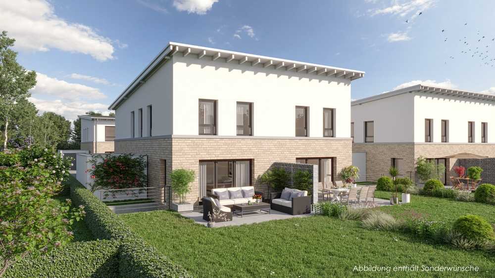 In ruhiger Hausnachbarschaft zeigen sich diese in 2-geschossiger Massivbauweise geplanten Einfamilienhäuser mit begrüntem Flachdach und PV-Anlage.