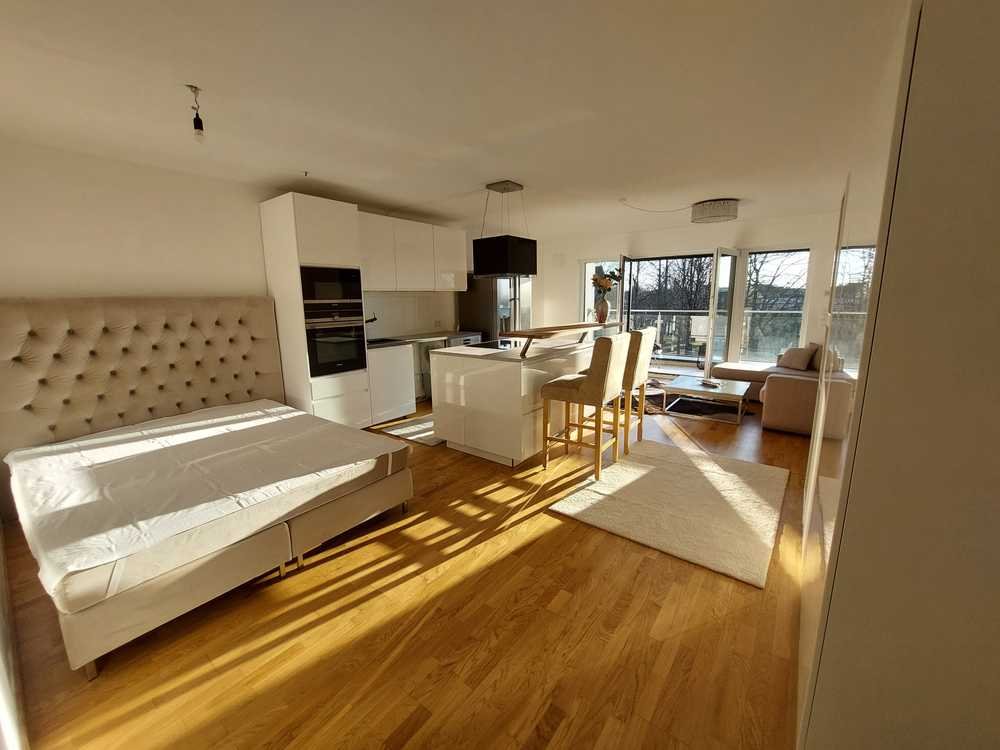 Dieses Appartment befindet sich in einem Effizienzhaus KFW 40+ Standard mit Schallschutzfenster. Ein Energieausweis liegt vor. Es handelt sich um ein neuwertiges Appartment im zweiten OG, die durch eine gehobene Innenausstattung wie Parkettboden, Fußbodenheizung, Videosprechanlage, elektrische Alu Rollos, dezentrale Lüftungsanlage mit Wärmerückgewinnung. Das Appartment ist völlig möbliert. Das heißt eine Einbauküche mit Siemens Markengeräten, Kochinsel mit Theke und Sitzgelegenheit, Boxspringbett, Ecksofa, Couchtisch, Kleiderschrank und im Flur eine Garderobe. Badezimmer mit Badewanne, Dusche mit Wandablauf und WC und Badmöbel. Durch einen Fahrstuhl gelangen Sie bequem ins entsprechende Stockwerk und das Apartment ist barrierefrei zugänglich. Die Loggia lädt zum Entspannen und Sonne tanken ein. Zur Wohnung gehören außerdem noch ein Keller mit Stauraum. Ein großzügiges, abschließbares Fahrradhäuschen steht zur Verfügung.
