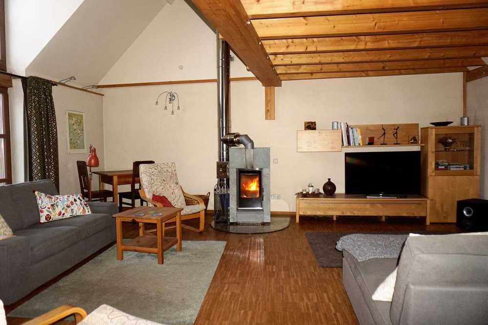 1 Schlafzimmer, 1 Wohnzimmer mit Galerie und Kaminofen, 1 Duschbad.