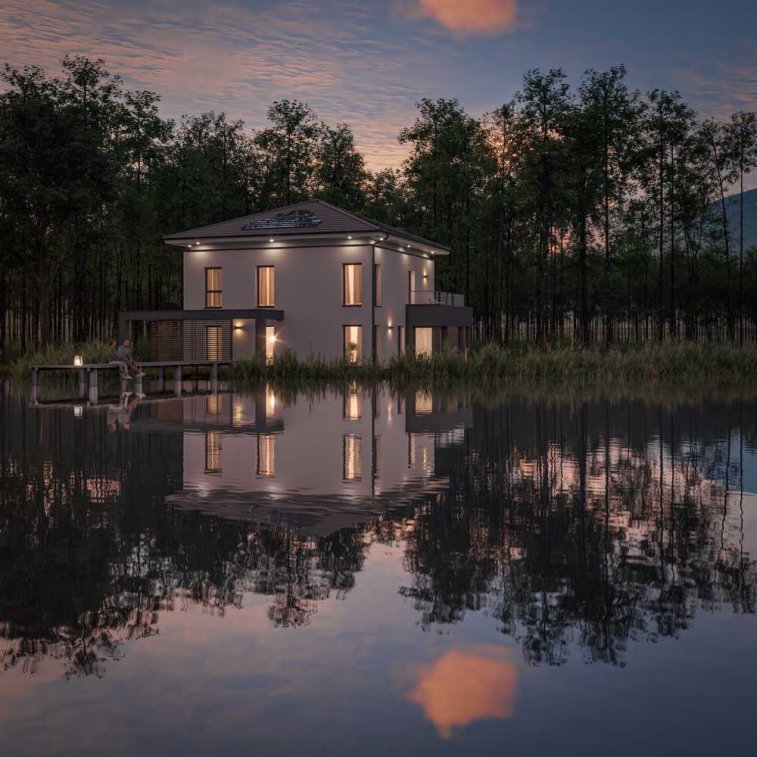 Das Haus ist auf einem realen Baugrundstück geplant oder auf einem Grundstück in einer Planungsphase. Die Bilder zeigen ggf. Extras, die im Rahmen des Bebauungsplans noch geprüft werden müssen.