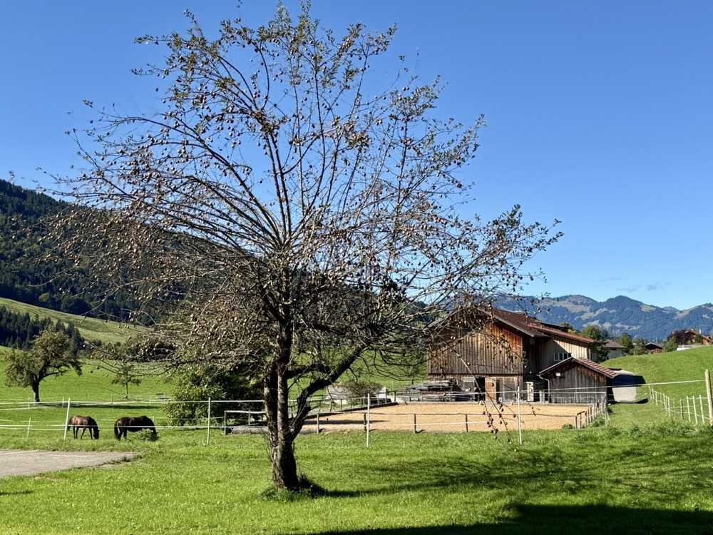 Der Blick erstreckt sich liebevoll über den nahegelegenen Pferdehof und in die Natur.