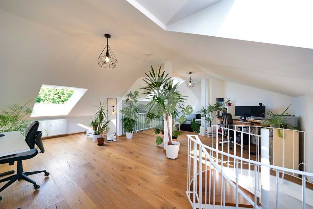 Die üppige Begrünung des angrenzenden Seeparks sorgt dafür, dass die Wohnung ganztägig hell bleibt, gleichzeitig aber in den intensiven Sonnenstunden angenehm von den Bäumen geschützt ist. Ein zweiter Zugang zum Balkon besteht direkt vom Wohnzimmer aus. Das ebenfalls offen gestaltete Wohnzimmer beeindruckt mit seiner außergewöhnlichen Raumhöhe und steht in direkter Verbindung zur darüberliegenden Galerie. Ein architektonisches Higlight, das dem Raum nicht nur Großzügigkeit, sondern auch eine besondere Helligkeit und Atmosphäre verleiht. Die darüberliegende Galerie ist über eine charmante Wendeltreppe, versehen mit hochwertigen Holztritten vom Entree-Flurbereich aus zugänglich. Beide Ebenen – Wohnzimmer und Galerie – stehen in harmonischer Verbindung zueinander und schaffen so ein ganz besonderes, exklusives Raumgefühl.