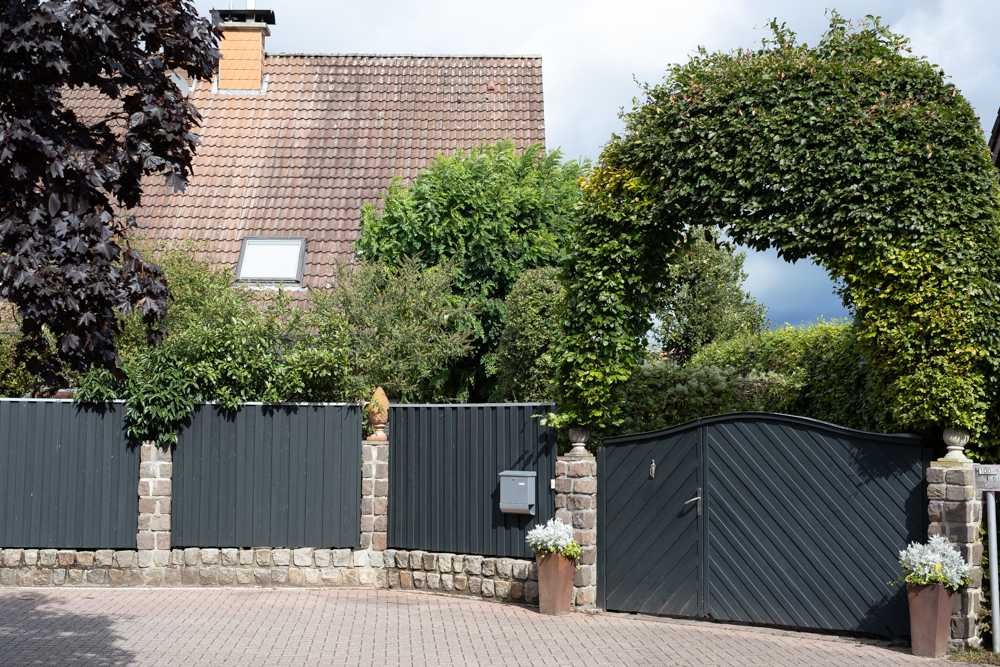 Sie betreten das Grundstück durch eine Toranlage mit einem grünen Torbogen und befinden sich direkt in einem wunderschönen, idyllischen Garten, der mit vielfältigen Grünpflanzen geschmackvoll gestaltet ist.