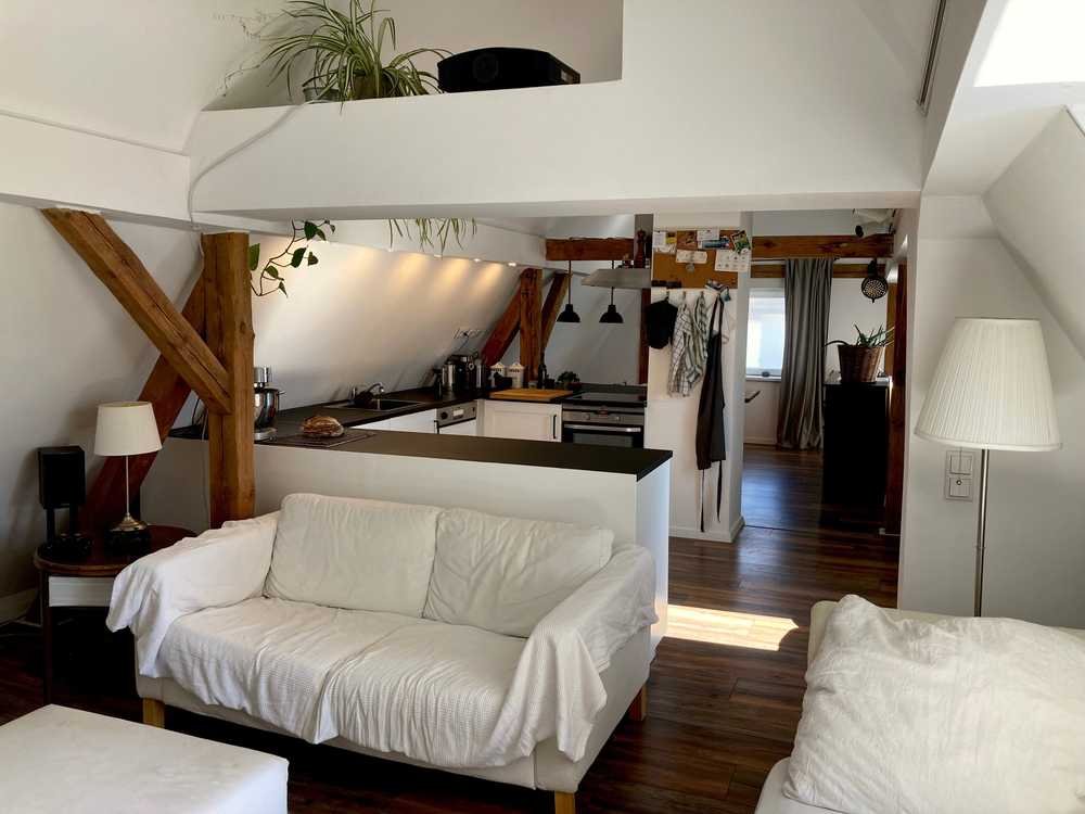 Offenes Konzept, das Wohnen und Kochen harmonisch vereint, ergänzt durch sichtbare Holzbalken, die eine besondere Atmosphäre schaffen.