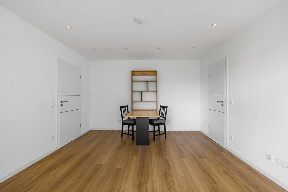 Der helle Wohn- und Schlafbereich besticht durch einen verklebten, hochwertigen Vinyl Laminatboden, der dem Raum ein elegantes und zugleich pflegeleichtes Ambiente verleiht. Eine abgehängte Decke mit dimmbaren Spotlights sorgt für eine moderne Atmosphäre und flexible Lichtgestaltung.