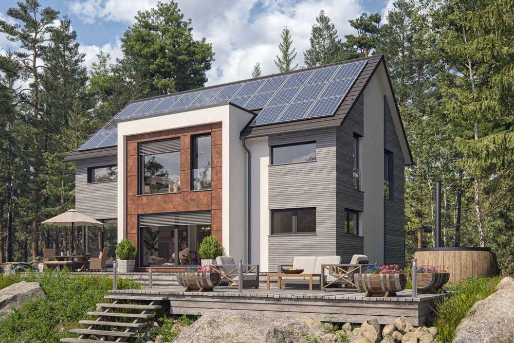 Stilsicher und modern präsentiert sich das Satteldachhaus Oregon. Die besondere Ausstrahlung entsteht durch die modernen Flachdachanbauten in Kombination mit großzügigen Glasflächen und wirkungsvoll platzierten Fassadenapplikationen. Der elegante und schlanke Baukörper bietet über 182m² Wohnfläche und damit reichlich Platz für die 4-5-köpfige Familie. Das Raumprogramm ist konsequent praxisorientiert und beinhaltet zusätzlich viele schöne Details wie z.B. die Eckverglasung im Wohnzimmer oder die große Hebeschiebetür im Esszimmer. Das Highlight in der oberen Etage ist das Schlafzimmer, denn hier sorgt ein großes Glaselement für einen besonderen Ausblick. Sehr zweckmäßig ist ganz nebenbei erwähnt auch das steile Satteldach, denn dadurch entsteht großzügiger und nützlicher Stauraum in Form eines Spitzbodens mit einer maximalen Höhe von weit über zwei Metern.