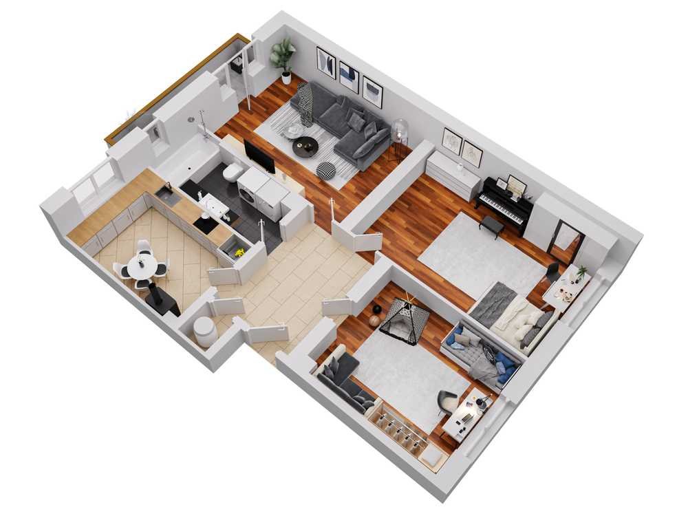 Die Wohnung besthet aus Wohnzimmer, Balkon, Wohnküche, Abstellkammer, Schlafzimmer, Gästezimmer/Kinderzimmer und Diele.