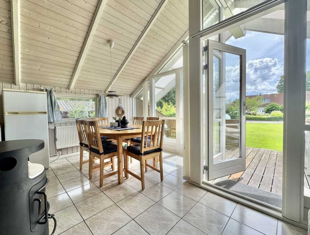 Das im Jahr 1995 erbaute dänische Haus überzeugt mit einem typischen skandinavischen Grundriss und einer durchdachten Raumaufteilung auf ca. 48 m² Wohnfläche. Highlight ist der offen gestaltete Wohn- und Essbereich mit vollständig verglaster Giebelseite, Kaminofen und offener Küche. Große Fensterflächen schaffen eine helle und freundliche Atmosphäre. Vor dem Wohnbereich lädt eine teils überdachte, großzügige Veranda zum Verweilen mit Blick in den Garten ein.