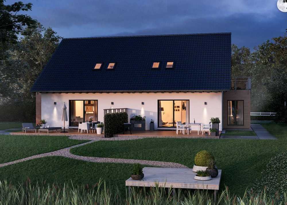 Im Erdgeschoss bilden Wohn-, Essbereich und Küche eine offene und harmonische Einheit, die zum gemeinsamen Leben einlädt. Im Obergeschoss unter dem klassischen Satteldach erwarten Sie ein Elternschlafzimmer, zwei Kinderzimmer und ein komfortables Badezimmer - ideal für Familien.