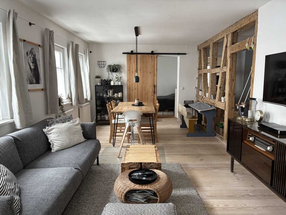 Im 1.OG befindet sich der sehr geräumige Ess- und Wohnbereich mit offener Küche, getrennt durch offenes Fachwerk, ein Zimmer und ein kleiner Raum, der bspw. als Büro genutzt werden kann.
