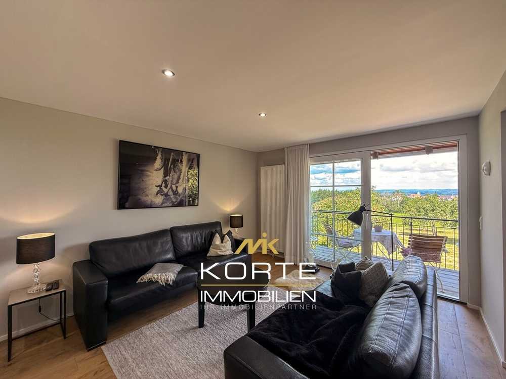 Im Obergeschoss: ein stilvolles Bad, ein Arbeits- und ein Gästezimmer sowie ein großes Wohnzimmer mit Balkon und einem Weitblick, der berührt. Sonnenuntergänge über den Hügeln des Allgäus – wie gemalt.