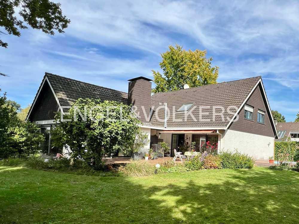 Dieses freistehende, in den Jahren 1974–1976 errichtete Ein- bis Zweifamilienhaus verbindet Großzügigkeit und Gemütlichkeit mit einer liebevoll angelegten Gartenwelt auf ca. 211 m² Wohnfläche. Betreten Sie das Haus, so eröffnet sich auf der rechten Seite ein weitläufiges Wohnzimmer mit Kamin und bodentiefen Fensterfronten. Es ist der ideale Ort, um gemütliche Abende am Kamin zu verbringen oder den Blick in den wunderschönen Garten schweifen zu lassen. Angrenzend an das Entrée liegt das Esszimmer. Ob Frühstück mit Blick in den Garten oder ein Abendessen mit der Familie – hier lassen sich Alltag und besondere Momente gleichermaßen genießen. Die angrenzende Poggenpohl-Küche ermöglicht kurze Wege. Das Erdgeschoss wird durch ein Schlafzimmer, ein Arbeitszimmer sowie ein Bad ergänzt. Mit blühenden Hortensien und einem gewachsenen Baumbestand präsentiert sich der Garten als echtes Refugium. Von einer Schaukel am Baum reicht der Blick auf das freistehende Haus bis zum Pool, wo Sie mit einer Tasse Kaffee entspannt in den Tag starten können. Die Terrasse in bevorzugter Ausrichtung ist mit einem Außenkamin ausgestattet und bietet den idealen Ort für besondere Momente – ob kurzweilige Grillabende oder ein entspannender Pool-Tag mit Freunden. Das weitläufige Grundstück hält zudem zahlreiche Rückzugsmöglichkeiten bereit – sei es für eine ruhige Auszeit mit einem guten Buch oder ein erholsames Sonnenbad. Im Obergeschoss befindet sich eine separate Wohneinheit mit drei Zimmern, Küche, Diele und Bad, die derzeit vermietet ist. Dies eröffnet die Möglichkeit, laufende Einnahmen zur Finanzierung zu nutzen oder generationsübergreifendes Wohnen zu realisieren. Zwei Garagen mit elektrischen Toren und großzügiger Zufahrt runden das Angebot ab. Herzlich willkommen in einer Immobilie, die hohen Ansprüchen an Privatsphäre ebenso gerecht wird wie der Flexibilität, individuelle Wohnträume zu verwirklichen.