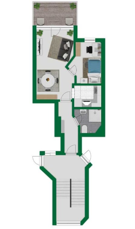In der Wohnung angekommen, erwartet Sie auf der rechten Seite ein praktisch geschnittenes Badezimmer, welches mit einer Dusche, Waschbecken und WC ausgestattet ist. Die Küche befindet sich direkt neben dem Badezimmer. Auf der linken Seite des Flures finden Sie einen kleinen aber praktischen Abstellraum.