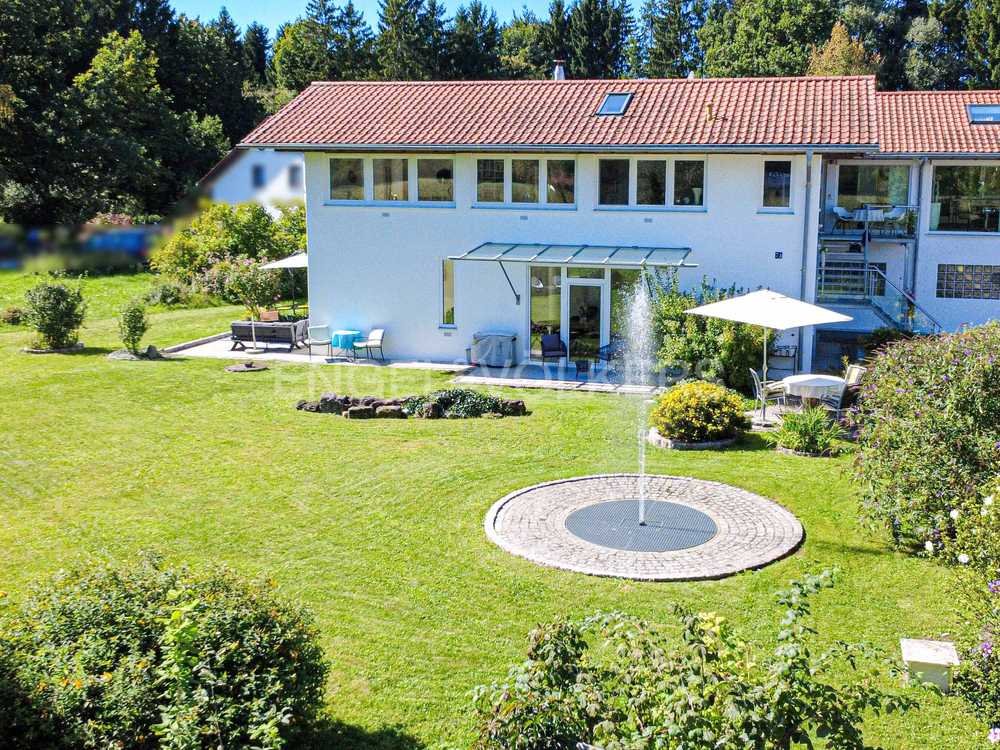 Bei dieser exklusiv von Engel & Völkers angebotenen Immobilie handelt es sich um ein modernes Zweifamilienhaus mit Einliegerwohnung, das im Jahr 2000 in massiver Bauweise errichtet wurde. 2013 erfolgte eine umfassende Modernisierung. In den Jahren 2021/2022 wurde das Anwesen durch einen hochwertigen Anbau erweitert und zuletzt 2023 nochmals modernisiert. Dabei wurden unter anderem sämtliche Fenster durch eine moderne Dreifachverglasung ersetzt, eine elegante Haustüre mit Fingerscan verbaut, sowie elektrische Rollläden im Erdgeschoss und im Neubau installiert. Zusätzlich wurde ein elektrisches Einfahrtstor eingebaut. Das Haus präsentiert sich heute in einem ausgezeichneten und zeitgemäßen Zustand. Die Gesamtwohnfläche von ca. 333 m² verteilt sich auf drei Einheiten und bietet vielfältige Nutzungsmöglichkeiten – ideal für Mehrgenerationenwohnen, die Kombination von Arbeiten und Wohnen oder zur Vermietung. Im Erdgeschoss überzeugt eine großzügige, lichtdurchflutete 3-Zimmer-Wohnung mit offenem Wohn-, Ess- und Kochbereich, einem Schlafzimmer, einem Kinderzimmer sowie direktem Zugang zu einem angrenzenden Stauraum, der sich bei Bedarf zu einer oder zwei Garagen umgestalten lässt. Ein modernes Bad mit XL-Dusche, eine weitere Dusche und ein WC runden diese Einheit ab. Das Obergeschoss umfasst eine weitere, komfortable 3-Zimmer-Wohnung mit offenem Wohnkonzept. Große Fensterflächen geben den Blick ins Grüne frei. Hier erwarten Sie ein modernes Bad mit ebenerdiger XL-Dusche, ein Schlafzimmer sowie ein Gäste- oder Arbeitszimmer. Die Einliegerwohnung im Dachgeschoss ist als modernes 2-Zimmer-Apartment mit Kochnische, großzügigem Bad, hellem Schlafzimmer sowie offenem Wohn-/Essbereich gestaltet. Durch die vielen Fensterflächen sowie Giebel- und Dachfenster entsteht ein außergewöhnliches Raumgefühl. Alle Wohneinheiten sind mit Fußbodenheizung, hochwertigen Böden, teils sichtbaren Holzbalken und modernen Ausstattungsdetails versehen. Im Kaufpreis sind die Einbauküchen enthalten. Zusätzlich stehen sehr große Dielenflächen mit praktischen Einbauschränken zur Verfügung. Um weitere Vorzüge dieses exklusiven Anwesens zu entdecken, lohnt sich ein Blick in den liebevoll neu gestalteten Garten. Hier bieten sich vielfältige Möglichkeiten zur Entspannung und Freizeitgestaltung. Ein eleganter Springbrunnen und insgesamt vier wunderschön angelegte Terrassen bieten entspannte Stunden mit einem herrlichen Blick in die Natur. Ein ganz besonderes Highlight ist der unverbaubare Bergblick, der diesem Anwesen eine außergewöhnliche Atmosphäre verleiht.