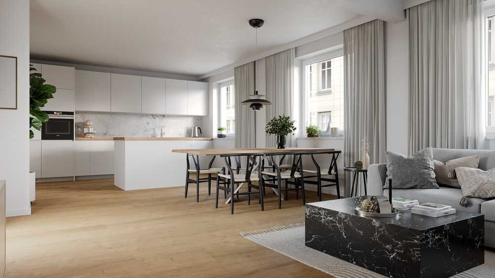 Die gesamte Liegenschaft wurde bereits in den Gewerken Fassaden, Dach, Haustüranlage, Treppenhaus, Untergeschoss, Hof, Technik, Versorgungsleitungen aller Art, Heizung als auch Innenausbau in zeitgemäßer Materialwahl sowie Markenqualitäten in die neue Zeit überführt und erfuhr hierbei einen frischen und ausdrucksstarken Charakter – Erstbezug nach umfänglicher Modernisierung.