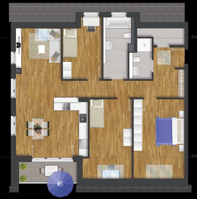 Autos verschwinden größtenteils in der Tiefgarage, sodass der Blick ins Grüne ungestört bleibt. Dank der durchdachten Süd-West-Ausrichtung profitieren die Bewohner von zahlreichen Sonnenstunden und einer angenehmen Wohnatmosphäre.