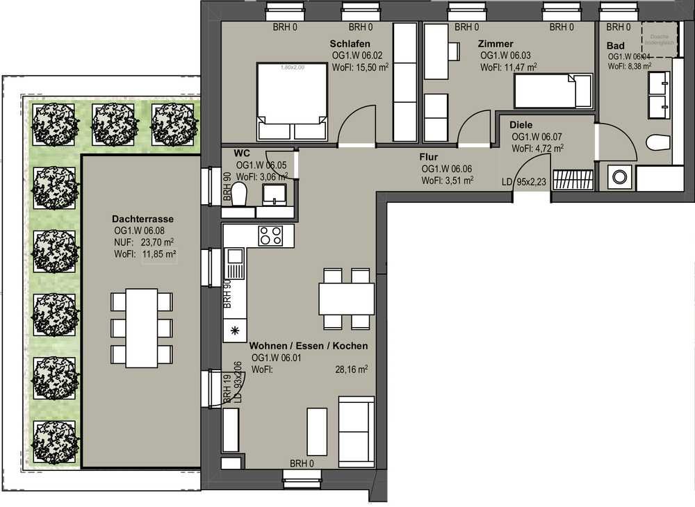 Natürlich hat die Wohnung neben der rund 24 m² (Nutzfläche) großen Dachterrasse noch einiges mehr zu bieten: