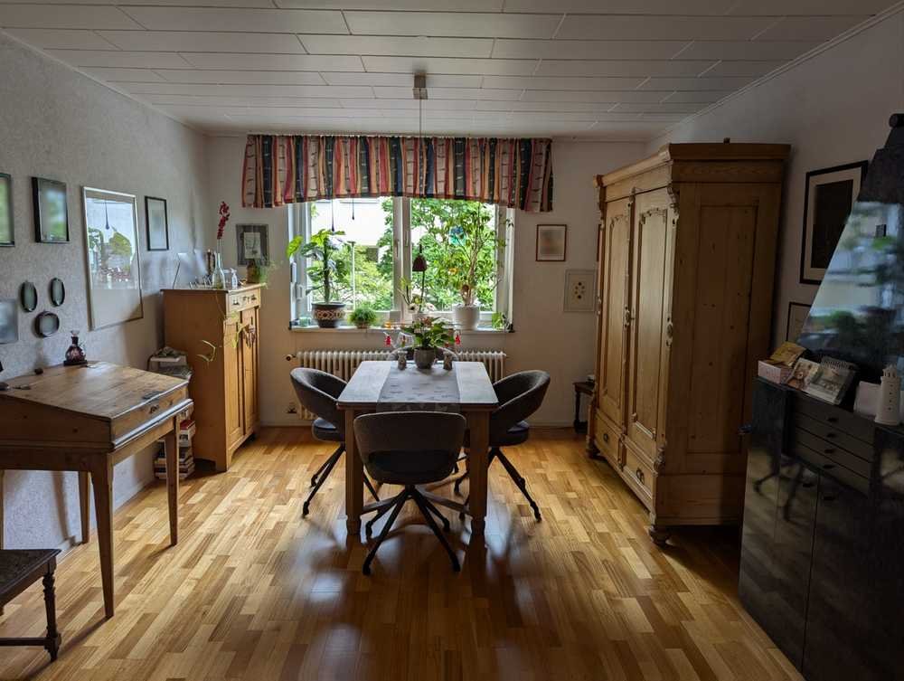 Das Schlaf-/Esszimmer, ebenfalls mit Parkettboden, kann flexibel genutzt und individuell gestaltet werden.
