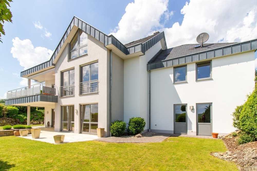 Hochwertig ausgestattetes großzügiges Wohnhaus in moderner Architektur mit Doppelgarage in herrlicher Randlage von Gusterath. Das Wohnhaus wurde in massiver Bauweise, eingeschossig mit ausgebautem Untergeschoss sowie ausgebautem Dachgeschoss erstellt. Mauerwerk als hochwertiges Massiv-mauerwerk, Decken als Stahlbetondecken. Die Beheizung und Warmwasserversorgung erfolgt derzeit durch eine Ölzentralheizung, Das Erdgeschoss verfügt über eine moderne Fußbodenheizung. Die Fenster sind als hochwertige Holz-Alufenster (Fabrikat Zöllner) ausgeführt. Das Haus verfügt über eine hochwertige Wärmedämmfassade. Die Treppe in der Hauptwohnung ist als schöne Holztreppe ausgeführt. Die Bodenbeläge in den Wohn- und Schlafräumen sind mit attraktiven Parkettböden und Fliesen versehen. Das Haus verfügt über einen Wäscheschacht vom Dachgeschoss ins Untergeschoss. Die Bäder sind mit hellen Fliesen und attraktiven Sanitärgegenständen in moderner Ausführung versehen. Das Haus verfügt über eine Regenwasserzisterne 8.000 Liter die der Toilettennutzung und der Grundstücksbewässerung dient. Das Hausanwesen besteht im Erdgeschoss aus dem sehr großzügigen hellen Bereich Wohnen/Essen von ca. 73 m ² mit Kaminofen und Zugang auf den großzügigen sonnigen Balkon von ca. 23 m². Von hier aus haben Sie eine herrliche Weitsicht. Ebenso gelangen Sie über eine Treppe in den schön angelegten Garten. Der Wohn/Essbereich ist teilweise mit einer Fernsehwand getrennt. An diesen Bereich grenzt die großzügige Küche von ca. 17 m² mit anschließendem Hauswirtschaftsraum von ca. 7 m. Die sehr großzügige Diele von 18 m² sowie das Gäste-WC vervollständigen das Angebot. Von der Diele gelangen Sie über eine Schleuse direkt in die geräumige Doppelgarage ca. 48 m² mit zusätzlichem Spitzboden. Sie gelangen über eine schöne Holztreppe in das Dachgeschoss. Die Galerie mit offenem Bereich dient als Erschließung der Räume. Von hier aus gelangen Sie in das große Elternschlafzimmer mit Ankleide von ca.25 m². Von hier aus gelangen Sie ebenso ist das moderne Bad mit Wanne und Dusche mit insgesamt ca. 22 m² mit zusätzlichem Ausgang auf den herrlichen Dachbalkon von 14 m². Von diesem haben Sie eine herrliche Weitsicht über das gesamte Tal. Ein sehr großes Studio/Kinderzimmer mit toller Dachgaube in einer Größe von ca. 36 m² sowie ein Kinderzimmer von ca. 17 m² (derzeit als Ankleidezimmer genutzt) vervollständigen das Angebot.