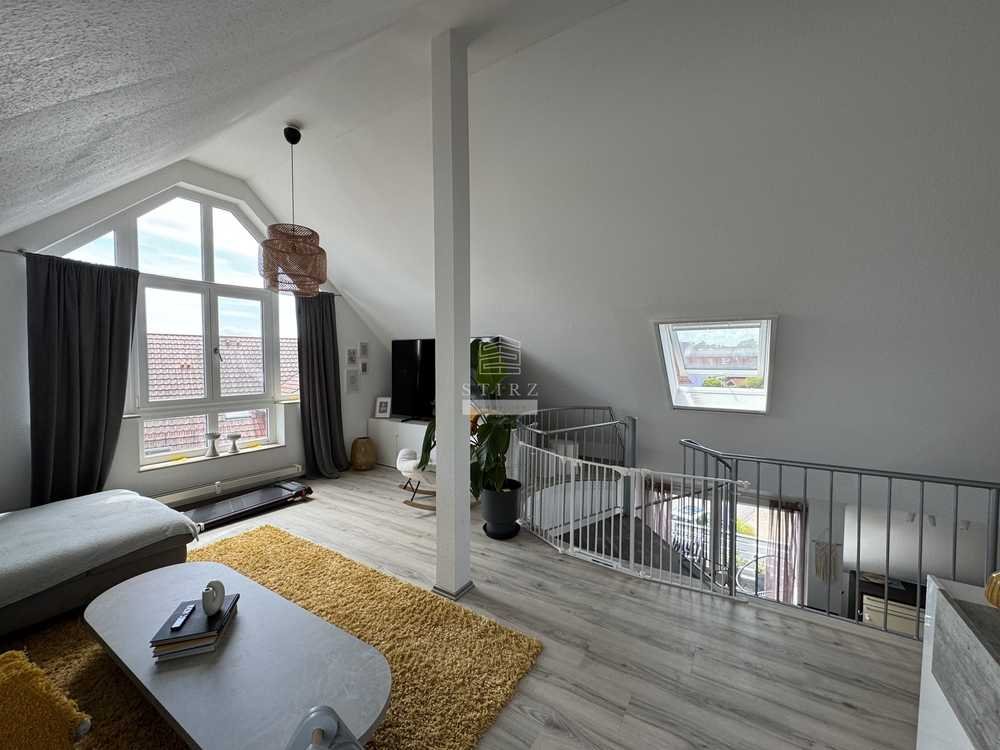 Über eine schöne Treppe erreicht man das obere Geschoss der Wohnung, das mit einem großzügigen Wohnzimmer besticht. Die Raumhöhe und die neuen Velux-Dachfenster mit integriertem Fliegenschutz sorgen für ein angenehmes Raumgefühl und viel natürliches Licht. Neben dem Wohnzimmer befindet sich ein weiterer Raum, der flexibel nutzbar ist – sei es als Ankleidezimmer, ruhiges Home-Office oder gemütliches Gästezimmer. Der angrenzende Balkon bietet Platz zum Entspannen und einen schönen Blick ins Grüne – ein idealer Ort, um den Tag ausklingen zu lassen.