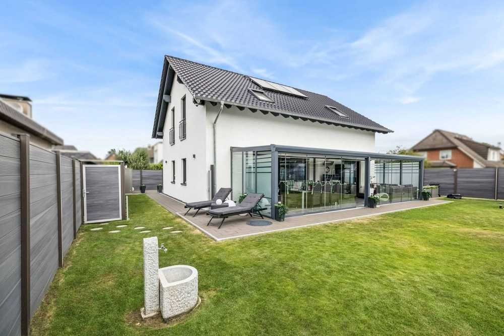 Ein besonderes Highlight ist die großzügige (ca. 30 m² große) überdachte Terrasse, die dank verschließbarer Seiten ganzjährig genutzt werden kann und ein wintergartenähnliches Wohngefühl vermittelt. Zudem verfügt die Terrasse über ein elektrisches Sonnensegel. Das ca. 520 m² große Grundstück mit gepflegtem Garten bietet zudem reichlich Platz zur Erholung. Zwei Sonnenterrassen, sowie ein Pool sorgen für höchsten Wohn- und Freizeitkomfort.
