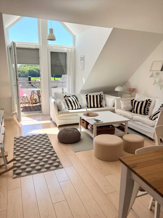 Auf dem angrenzenden schönen großen Balkon mit Massivholzdielen und fest installiertem Ampelschirm, lassen sich entspannte Stunden mit einem schönen Ausblick verbringen.