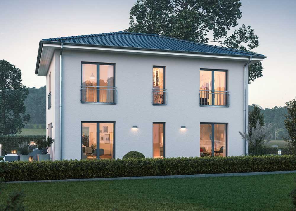 Bodentiefe Verglasungen lassen viel Licht in das Einfamilienhaus LifeStyle 18.07 und machen das selbstbestimmte Wohnen auf den großflächigen Wohnebenen noch schöner. Weitere Schmuckstücke des Hauses sind der offene, über Eck angelegte Wohn-, Ess- und Küchenbereich oder der gerade Treppenaufgang, der raumsparend zu den großzügigen Zimmern im Dachgeschoss hinaufführt. Die schlichte und dennoch ausdrucksstarke Außenansicht sowie ein klassisches Satteldach prägen den wesentlichen Stil des Hauses.