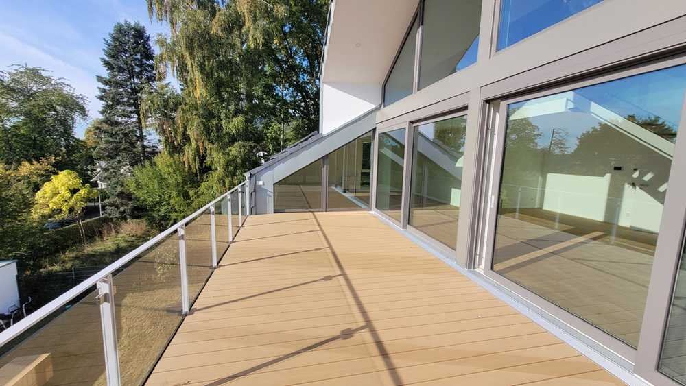 Die Wohnung selbst empfängt Sie mit einem großzügigen Eingangsbereich, der Raum für eine geräumige Garderobe bietet. Herzstück der Wohnung ist der weitläufige, lichtdurchflutete Wohn- und Essbereich mit angrenzendem Küchenbereich, der bis zum Giebel geöffnet ist und dadurch ein beeindruckendes Raumgefühl vermittelt. Von hier aus gelangt man auf die große Dachterrasse mit Blick ins Grüne und Fernblick über die Dächer der Nachbarhäuser. Ein Wasseranschluss wurde auf der Dachterrasse installiert. Die großzügige Dachterrasse ist mit pflegeleichtem WPC-Belag ausgestattet und lädt zum Entspannen im Freien ein. Große Fensterflächen mit Dreifachverglasung, Fußbodenheizung und edler Parkettboden schaffen ein harmonisches Zusammenspiel von moderner Architektur und behaglicher Wohnatmosphäre. Zudem befinden sich auf dieser Ebene zwei Zimmer, ein Gäste-WC sowie ein komfortables Bad mit bodentiefer Dusche. Bei Bedarf kann ein Teil des Wohnzimmers separiert und dadurch die Anzahl der Zimmer erhöht werden.