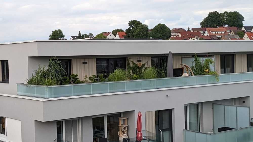 Ein großer Wohnraum bestehend aus Wohnzimmer, Esszimmer und Küche (Firma Held Geislingen) bildet das Zentrum der Wohnung mit direktem Zugang zur 34qm großen Dachterrasse. Hinter der Küche befindet sich eine großzügige Speisekammer. Das Büro / Kinderzimmer ist wie das große Bad direkt aus dem Wohnraum erreichbar. Der Zugang zum Schlafzimmer erfolgt über das Bad. Neben dem Wohnungseingang ist eine kleine Kammer als Garderobe vorhanden. Ein großer Kellerraum bietet genügend Platz.