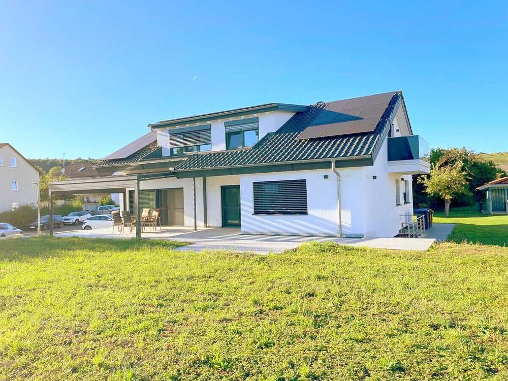 Dieses freistehende Haus auf sonnigem Südwest-Grund befindet sich in sehr ruhiger und bester Wohnlage von Giengen an der Brenz und bietet als Besonderheit die Möglichkeit der Nutzung nicht nur als Einfamilienhaus sondern auch als Zweifamilienhaus, da das Erdgeschoss und das Obergeschoss als jeweils eigene Wohnungen ausgebildet sind, welche zusammen aber auch getrennt voneinander genutzt werden können. Dies ermöglicht die Nutzung als Mehrgenerationenhaus oder zur separaten Aufnahme für ein Aupair oder einen Pfleger, zum Wohnen und Arbeiten unter einem Dach aber auch zum einen Teil vermieten und einen Teil selbstbewohnen. Die Möglichkeiten sind damit unbegrenzt. Das Grundstück besitzt eine große Doppelgarage mit anschließendem Werkstattraum. Von dieser Garage gelangen Sie direkt zum Hauseingang. Hinter diesem befindet sich das Treppenaus von welchem Sie sowohl in die Wohneinheit im Erdgeschoss als auch in die Wohneinheit im Obergeschoss kommen. Im Erdgeschoss empfängt Sie zunächst eine geräumige Diele mit viel Platz für eine Garderobe und bereits dem Gäste-WC. Auch ein Abstellraum befindet sich gleich hier. Von der Diele gelangen Sie sowohl in die große Wohnküche mit Tresen als auch in den überwältigenden Wohnbereich, auch Küche und Wohnbereich sind offen miteinander verbunden. Der Wohnbereich ist durch umlaufende bodentiefe und raumhohe Panorama-Schiebetüren nach Süden und Westen ausgesprochen hell und führt überall hinaus auf die umlaufende Terrasse mit Teilüberdeckung und den umlaufenden Garten - ein Traum. Seitlich und mehr privat befinden sich noch ein großes Schlafzimmer, ein großes Badezimmer und ein weiteres Zimmer als Arbeits- oder Gäste-Zimmer, ebenfalls mit Terrassenzugang. Im Obergeschoss befindet sich ein überwältigender Wohnraum mit offener Küche, ein sehr großes Schlafzimmer mit eigenem Balkon und Blick über die Landschaft sowie ein sehr großes Badezimmer. Alle Räume sind auch hier ausgesprochen hell. Zwei Hobbyräume und ein WC sind im Untergeschoss.