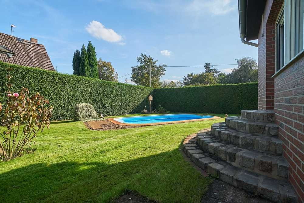 Der Außenbereich überzeugt durch einen liebevoll gestalteten Garten mit Pool, eine gepflegte Rasenfläche und Rückzugsmöglichkeiten. Ergänzt wird das Grundstück durch ein Gartenhaus mit Außenkamin, das sowohl für gesellige Stunden im Freien als auch zur praktischen Aufbewahrung von Gartengeräten dient. Eine Garage mit elektrischem Tor sorgt für Komfort und Sicherheit beim Abstellen von Fahrzeugen.