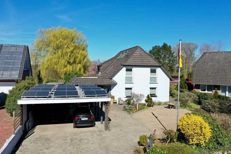 Dieses stilvolle Zweifamilienhaus wurde im Jahr 1995 auf einem großzügigen Grundstück mit 2.000 m² Fläche in exklusiver Wohnlage von Mulmshorn errichtet. Es bietet viel Raum für die ganze Familie und überzeugt durch eine durchdachte Raumaufteilung sowie zahlreiche Komfortmerkmale wie ein Carport mit Solaranlage, einen Pool und eine Wallbox für Elektrofahrzeuge.