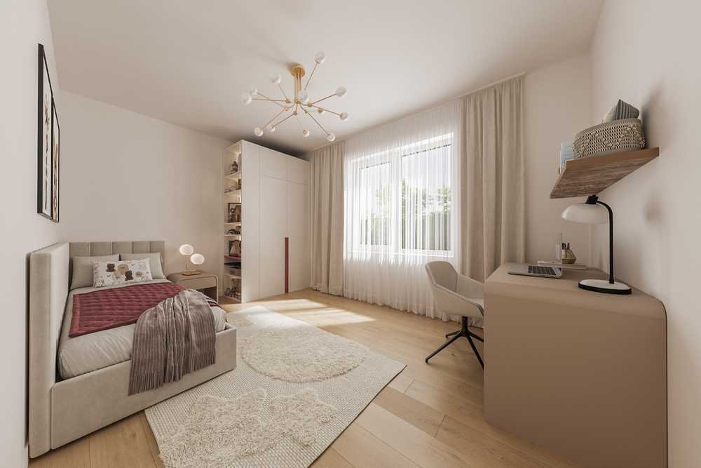 Das Obergeschoss bietet drei flexibel nutzbare Zimmer sowie ein elegantes Familienbad mit Badewanne und bodengleicher Dusche. Alle Räume sind smart-home-fähig vorbereitet und mit Netzwerk- und TV-Anschlüssen ausgestattet.